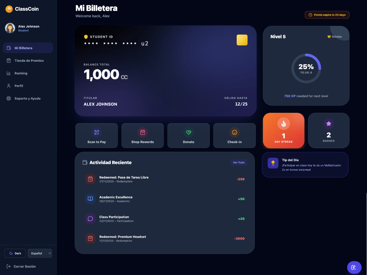 ClassCoin es la plataforma que permite a los profesores premiar con puntos canjeables por beneficios internos del colegio y productos en comercios, mejorando la convivencia, la motivación en el aula y la economía local.